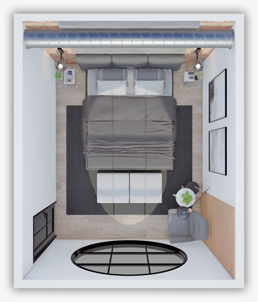 Quickly choose from a selection of design layouts to match your vision for an industrial bedroom.