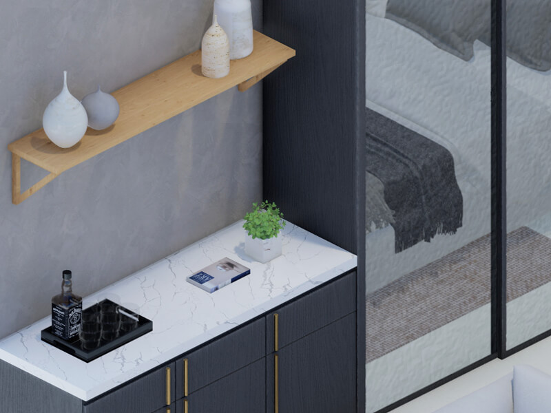 Mirrors add volume to your space. Plus, it’s a functional full body mirror which is also a decorative element. Add a touch of wood to the space to achieve the contemporary aesthetics you really want!