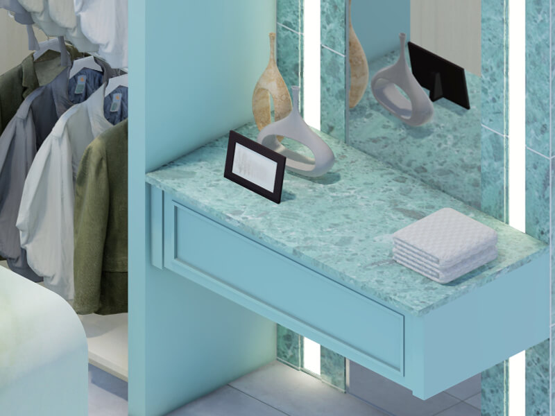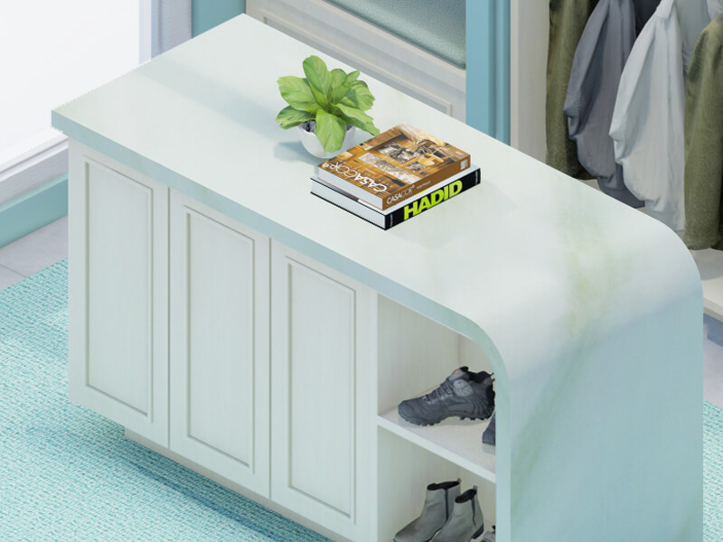 A beach style closet vanity top brings the relaxing and serene vibes of the seaside into your everyday routine. With its light and airy color palette, reminiscent of sand and sea, this vanity top creates a tranquil and coastal atmosphere in your closet space.