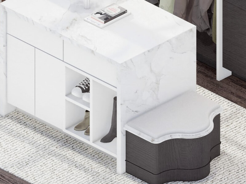There is a current trend in closet design of creating storage solutions that make the most efficient use of space. This means that closets are being designed to maximize storage capacity while still remaining within the confines of the overall space available. This space has a contemporary look with a color palette that brings out the best in your home's existing interior spaces. The walls and ceiling are light-colored, and the flooring is high-gloss and polished. This chic and stylish closet is designed to make the most of your space, whether you have a small apartment or condo. We can make your closet dreams come true at Contemporary Closets with its rows and rows of shelving, plus a few fold-down racks, providing ample room for clothing of all types. Here you will find stylish clothing and accessories neatly displayed. Sleek and chic furniture completes the look.