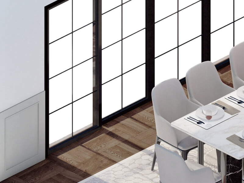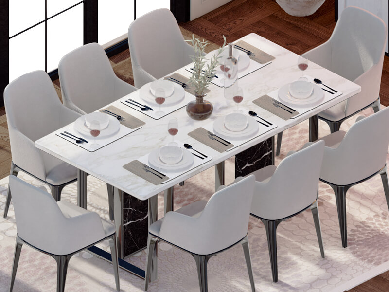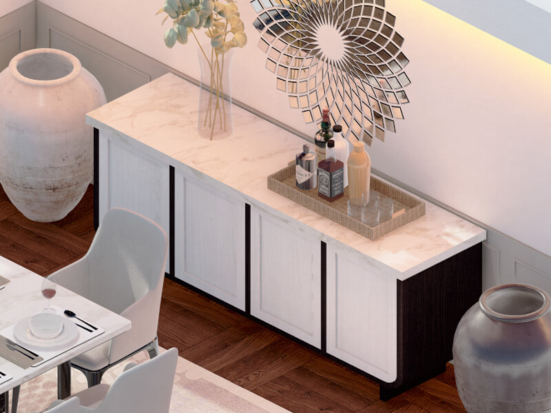 Your transitional dining room design plan is the perfect way to bring together traditional and contemporary elements, creating a crisp and clean look. This space usually features a neutral color palette of gray and brown. Wood, stone, and metal can provide interesting contrast in a room, with wood floors being a popular choice for the primary design element. Lighter-hued wood panels can help brighten a space, and skylights are also a great way to bring in natural light.