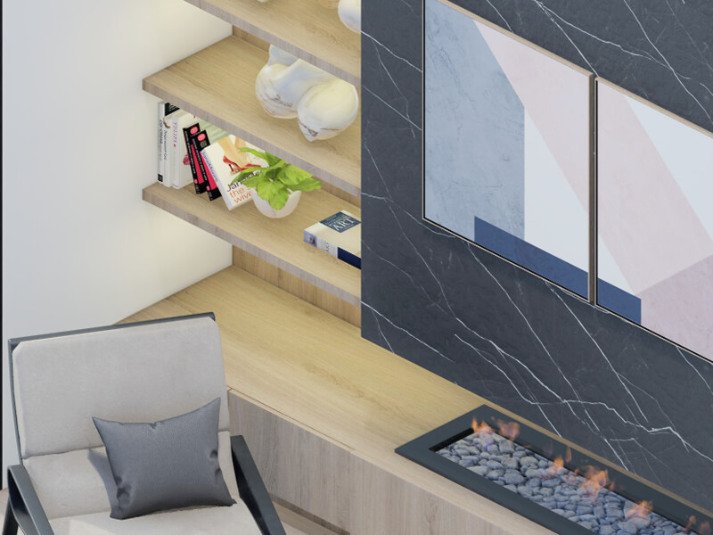 Looking for a sleek and contemporary fireplace design? Tiny Rooms is the perfect place to start your search. Fireplaces are available in a variety of shades to match your wood furnishings and create a stunning monochromatic effect. The black fireplace surround is sleek and adorned with a geometric pattern. The bookshelf next to it has similar designs, but with vertical and horizontal lines to accent the stylishness of the fireplace. The small decorative mirror on the mantelpiece reflects light upwards, adding to the cozy ambiance and creating a warm atmosphere. The light reflecting off of the mirror brightens up the room and makes it feel more welcoming.