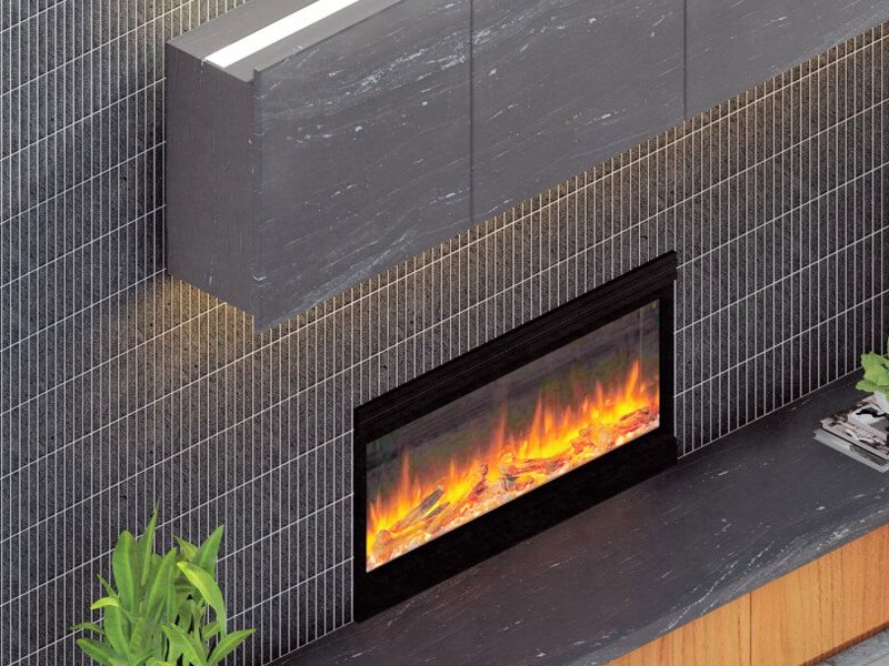 Looking for a sleek and Mid-Century Modern fireplace design? Tiny Rooms is the perfect place to start your search. Fireplaces are available in a variety of shades to match your wood furnishings and create a stunning monochromatic effect. The black fireplace surround is sleek and adorned with a geometric pattern. The bookshelf next to it has similar designs, but with vertical and horizontal lines to accent the stylishness of the fireplace. The small decorative mirror on the mantelpiece reflects light upwards, adding to the cozy ambiance and creating a warm atmosphere. The light reflecting off of the mirror brightens up the room and makes it feel more welcoming.
