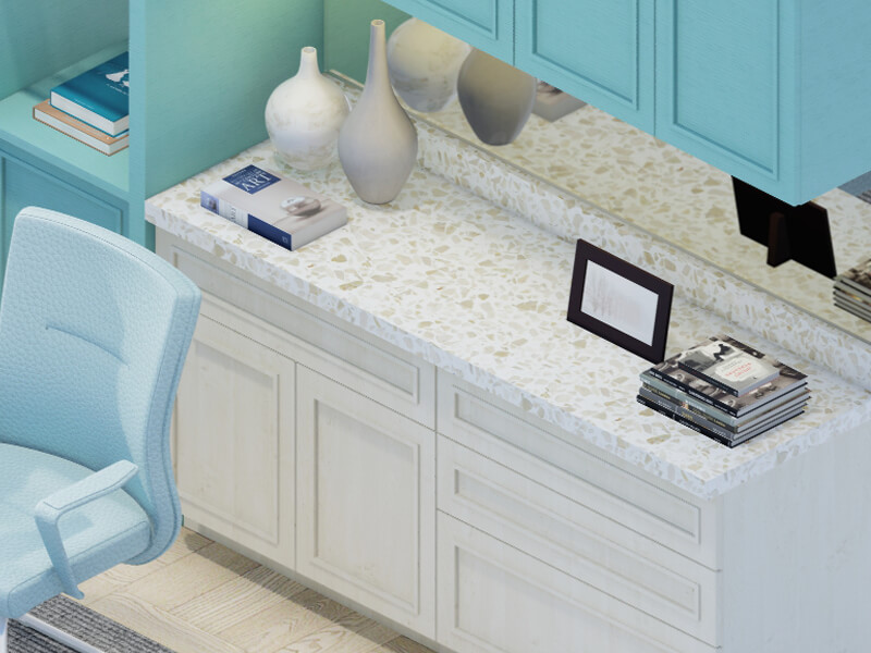 The counter is adorned with coastal-inspired elements such as natural wood finishes, soft pastel colors, and subtle nautical accents. It provides ample space for organizing your office essentials, displaying decorative items, or showcasing your favorite beach-themed accessories.