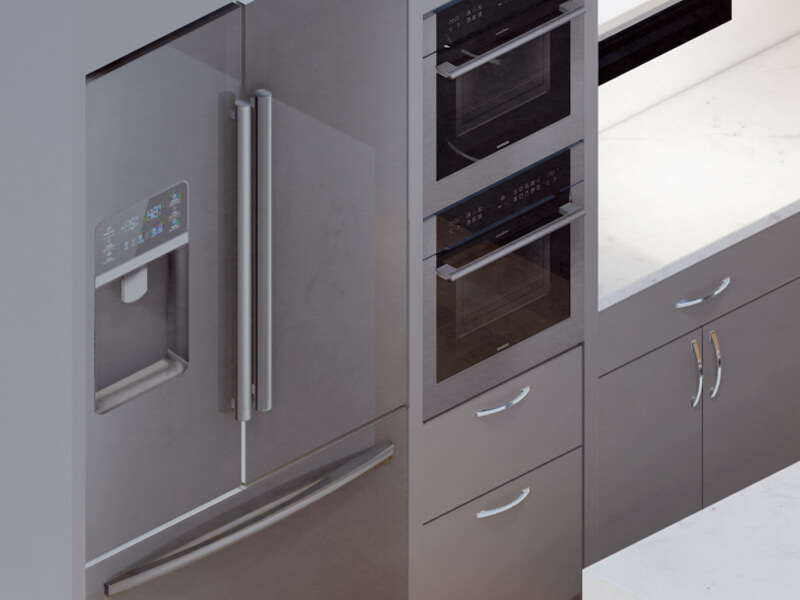 Contemporary kitchens typically boast minimalistic designs with linear, geometric themes. To add a touch of modernity, asymmetrical balance is often included in the décor. cabinets and molding are usually very simple and frameless, with large, easy-to-use hardware. The two main types of doors are slab and horizontal lift. You can also have frosted glass panels or door inserts. Laminated surfaces are available in either clean white or bold colors, depending on your preference. Cabinetry designs often incorporate rectangle and square shapes with flat doors, without any type of recessed panels or ornamentations.