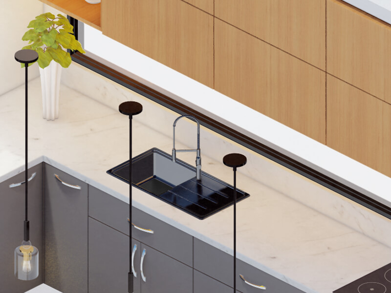 This design uses sleek and clean lines with high-shine or matte finishes. The hardware is often the same, too, so there are door pulls for lower drawers and knobs for cabinets.
