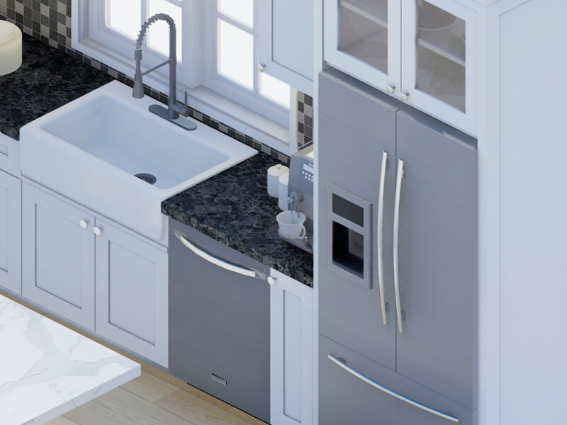 This kitchen design has the perfect balance of modern and traditional elements. The colors are warm and cool, and it has a sophisticated low-key look. The cabinet design with square doors and an inset panel can be easily updated with a Shaker-style door with a natural timber finish. A kitchen cabinet design with square doors and an inset panel can be easily updated by adding Shaker-style doors with a natural timber finish. To brighten and deepen the space, paint the walls in whites or off-whites. For a low-maintenance kitchen that is also strong and durable, use linen, hessian, cotton, and velvet textures in your soft furnishings.