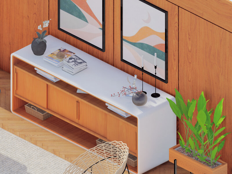 This design is super functional, with convenient cabinets and a great combination of wood and brass! It has a smart mid-century aesthetic that will never go out of style.